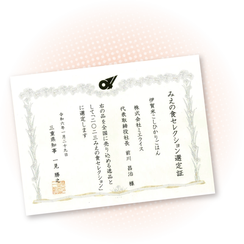 当社が開発した、人気の伊賀米こしひかり「パックごはん」は、三重県による「みえの食セレクション」にも選定される。さらに、三重県産「結びの神」の「米粉」が入ったそうめん「ミエノナツ」を地元企業と共同開発するなど、三重県農産物の振興に貢献しています。
