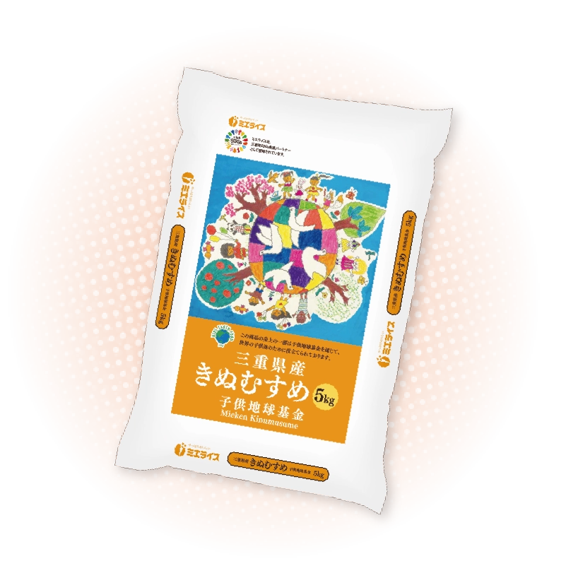 子供地球基金は、子供達の描いた絵を用いた商品の収益金を、世界の子供達に還元する取り組みです。ミエライスは子供地球基金の活動に賛同し、支援のためオリジナル商品三重県産「きぬむすめ」を企画し販売。本商品の売上の一部を寄付しています。